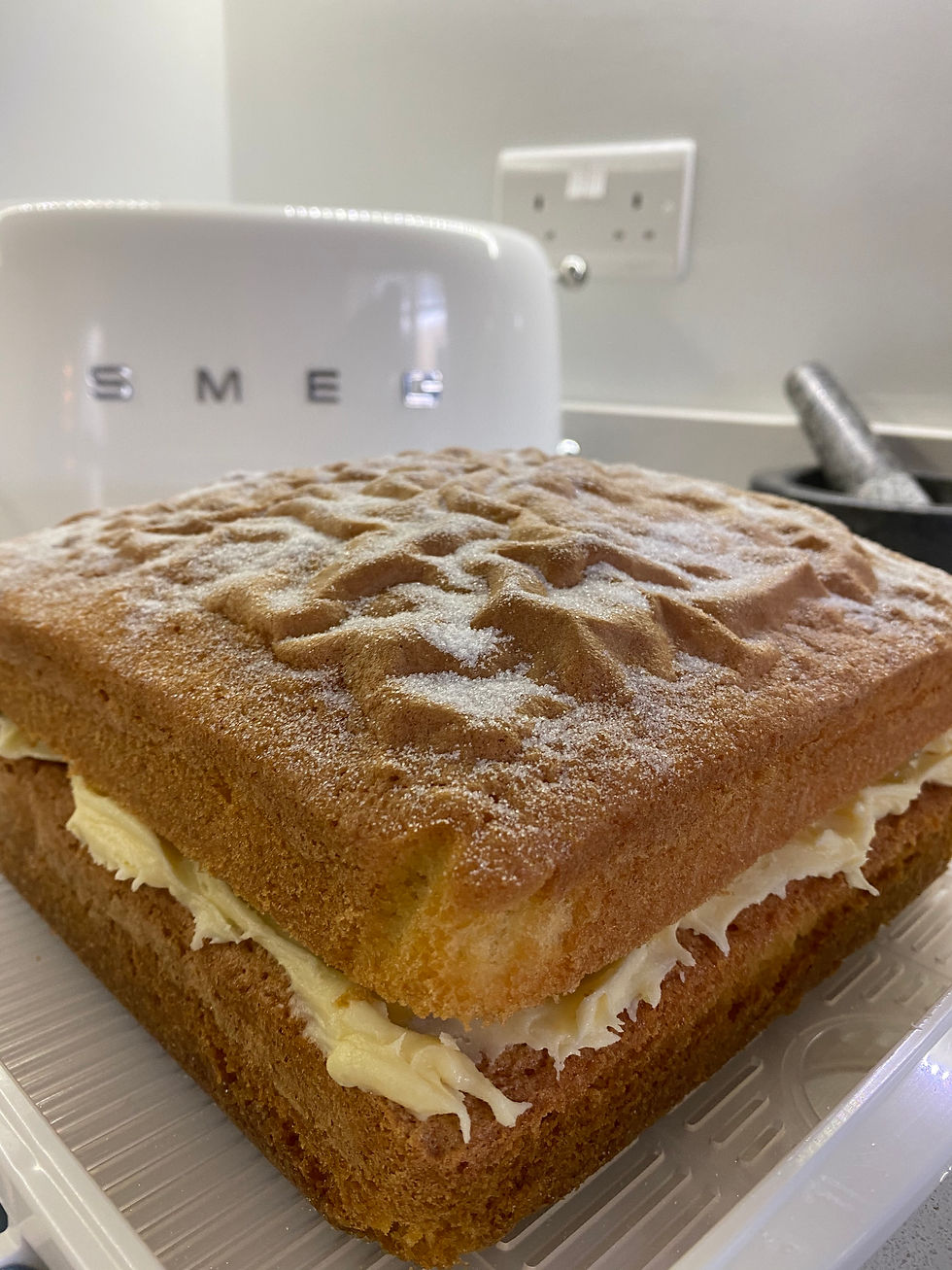 This sponge cake came about because I had a 3/4 jar of lemon curd in my fridge that I needed to use up and it was coming up to a Friday and we always take the builders cake.