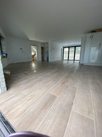 The Bar has been started but the top half can't be completed until the granite top is fitted, which will be a couple of weeks yet, at least. Once the Kitchen fitters had cleared out all their stuff the tilers were able to finish laying the floor in this huge open plan room.