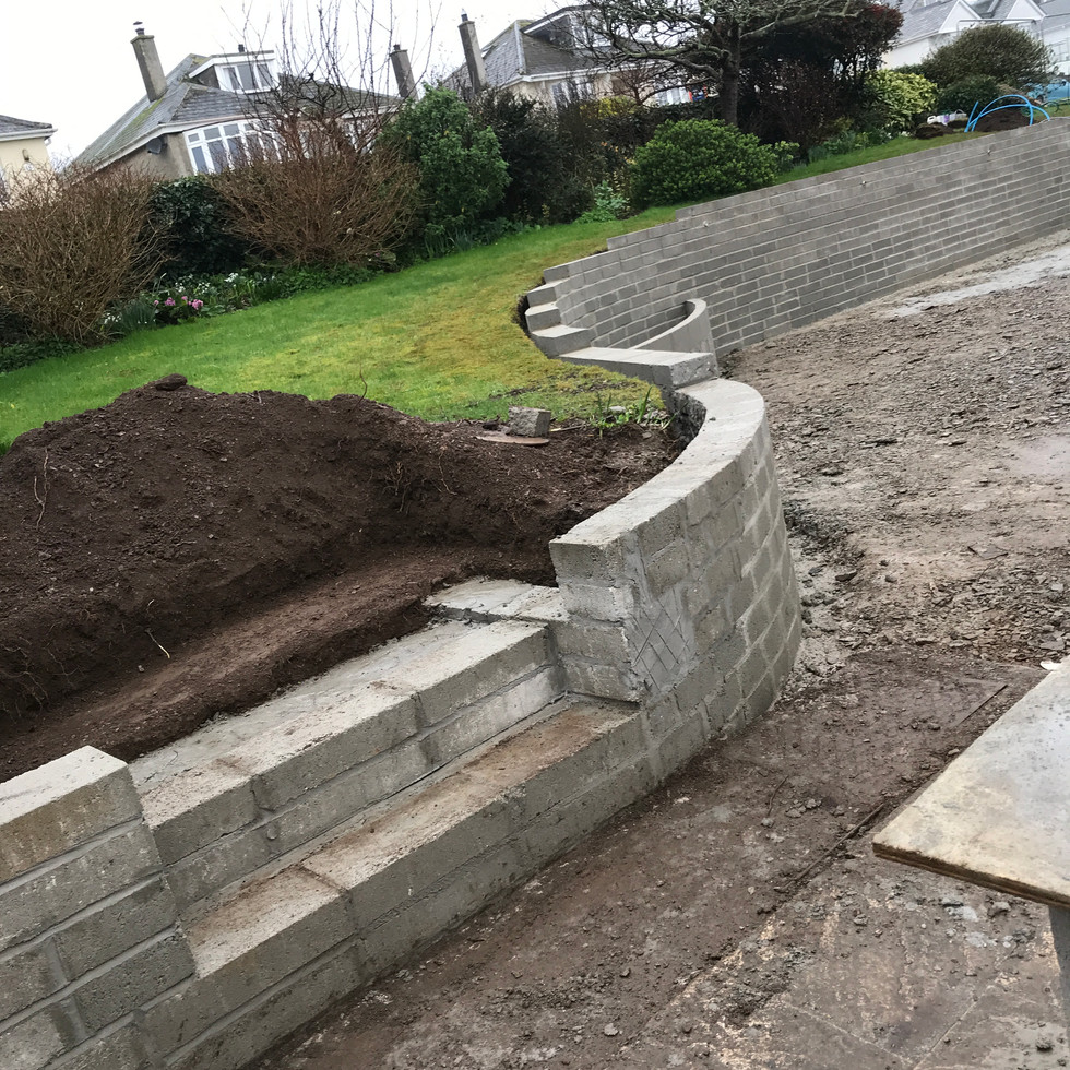 Another key level discussion was the level of the retaining wall. Not only does the garden the wall is holding back slope significantly from front to back it also slopes sided to side! I must say I quite like a bit of quirkinesses so we aren’t going to fuss too much about how the grass meets the beautifully level wall, but we did need to give some considered thought to where the conduit for the lights will need to come through the wall before they back fill behind it.