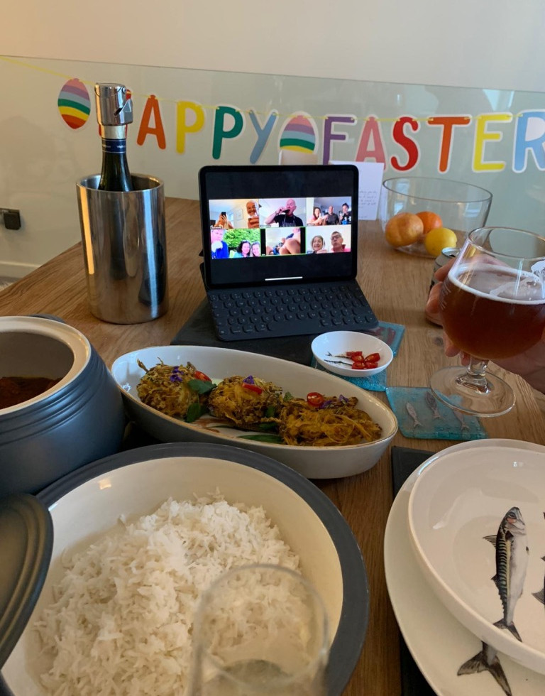 I'm not sure who suggested it, but before we knew it our early friday call and sundowner metamorphised into "lets all cook a Curry and eat it together next week!". Ali P being the "Curry King" between us, sent the menu and recipes out to everyone and before we knew it, there we were, having all cooked the same dishes, comparing our Onion Bhaji's and eating our curry's together. Such a laugh, great food, truly breaking the bordem and keeping us all connected.